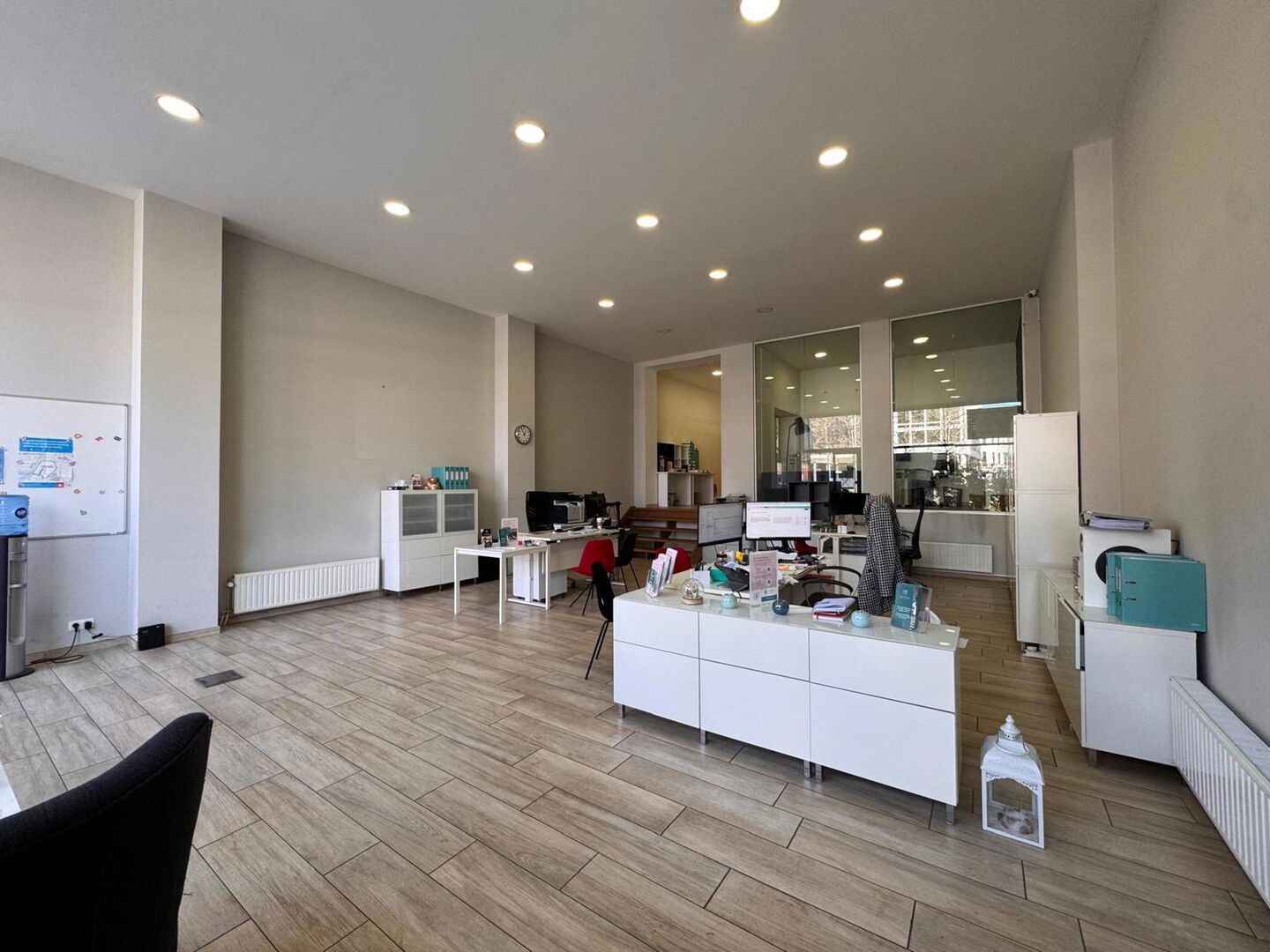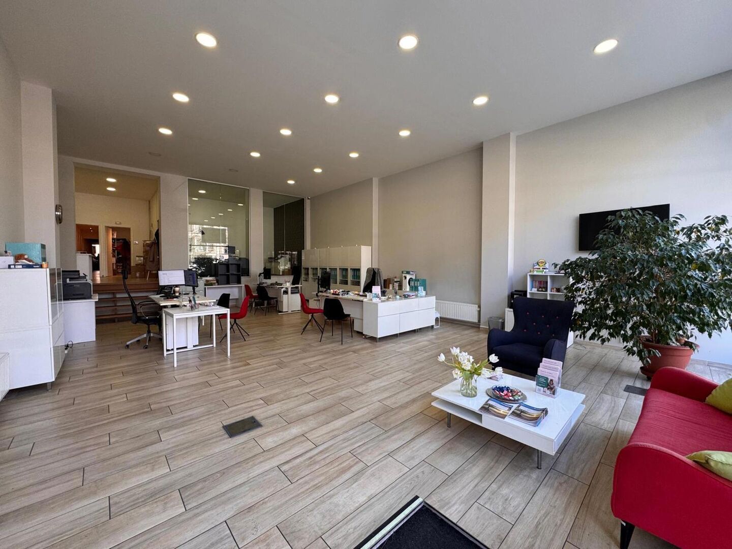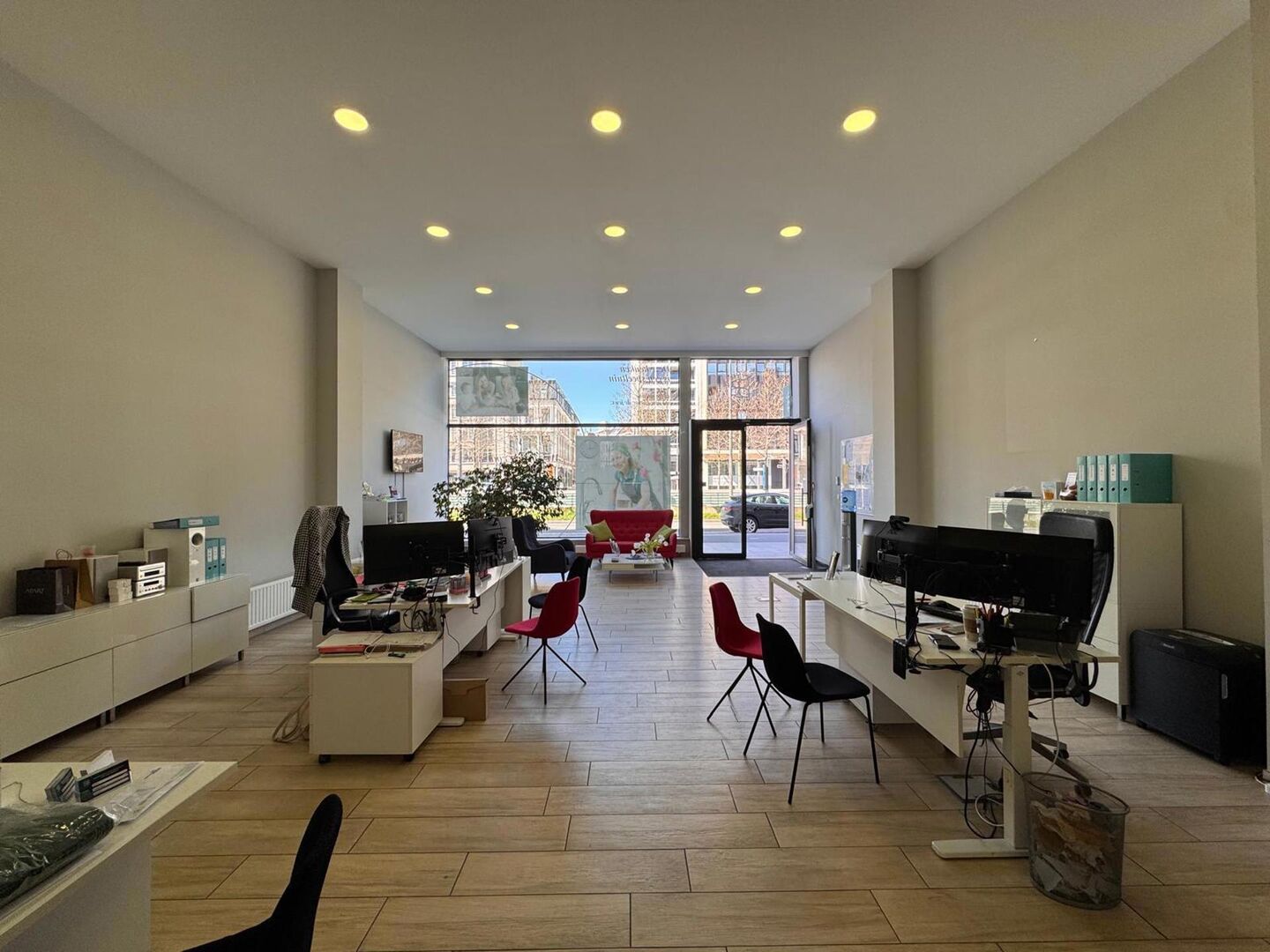 De ruimte is praktisch ingedeeld. Vooraan bevindt zich een ruime open kantoorzone die flexibel kan worden ingericht als open workspace, showroom of praktijkruimte. Daarnaast zijn er aparte kantoorruimtes voorzien die zich perfect lenen voor overleg of werk in alle privacy.