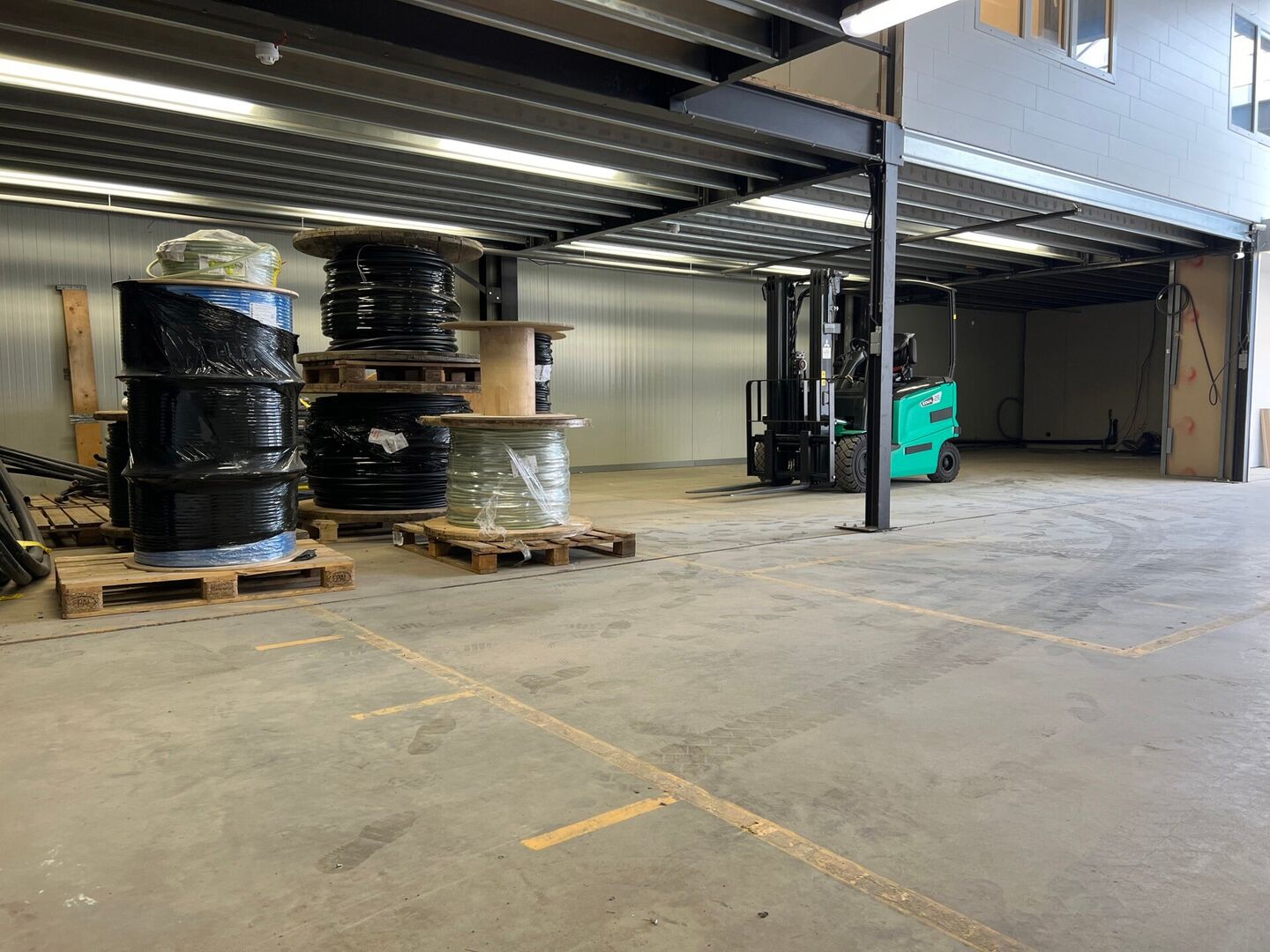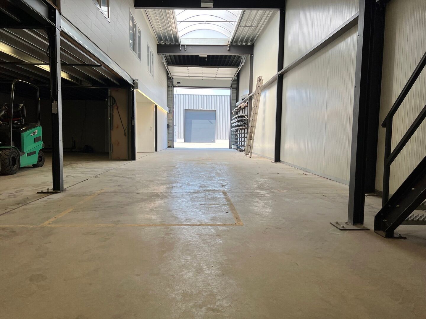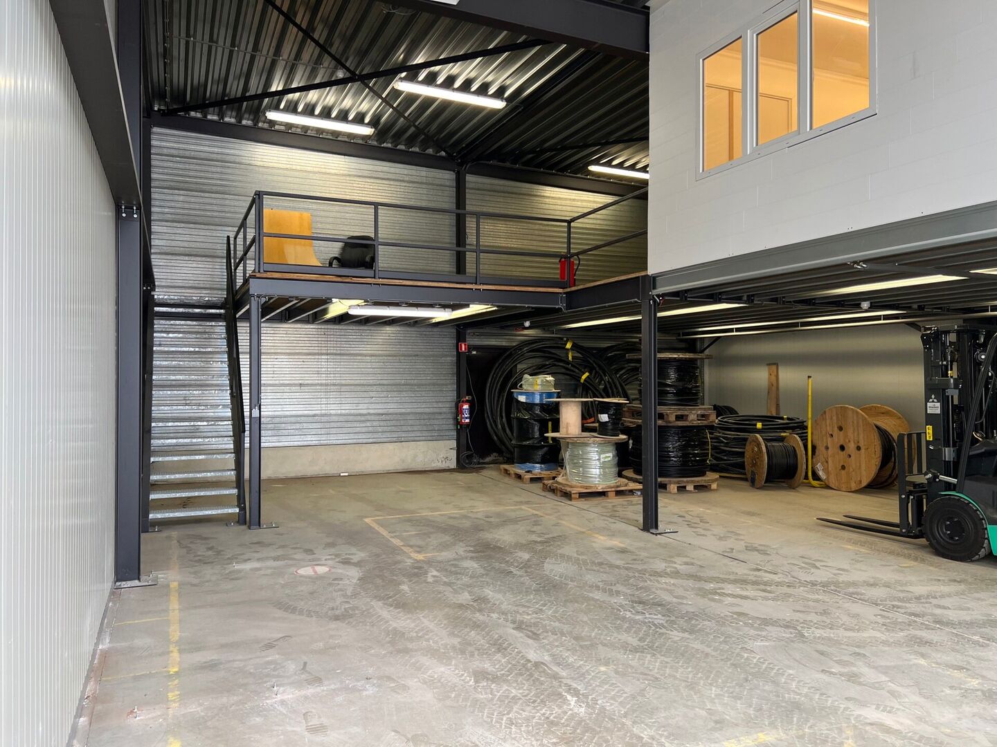 Het magazijn biedt ca. 240 m² opslagruimte met een vrije hoogte van 5,5 meter en een elektrische sectionaalpoort. Op het gelijkvloers bevindt zich een ingericht kantoor of ontvangstruimte van ca. 20 m², terwijl de eerste verdieping een kantoor van ca. 90 m² biedt, voorzien van ingemaakte kasten en airconditioning. Daarnaast is er een mezzanine van ca. 55 m² voor extra opslag.