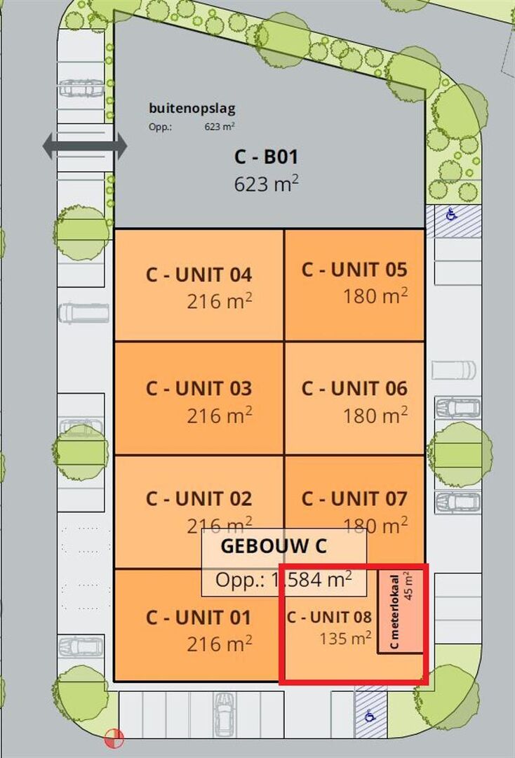 Deze unit heeft een oppervlakte van ca. 180 m², bestaande uit ca. 135 m² opslagruimte en ca. 45 m² kantoorruimte.